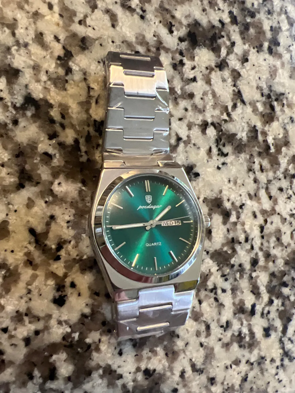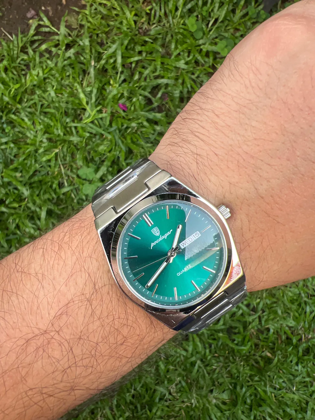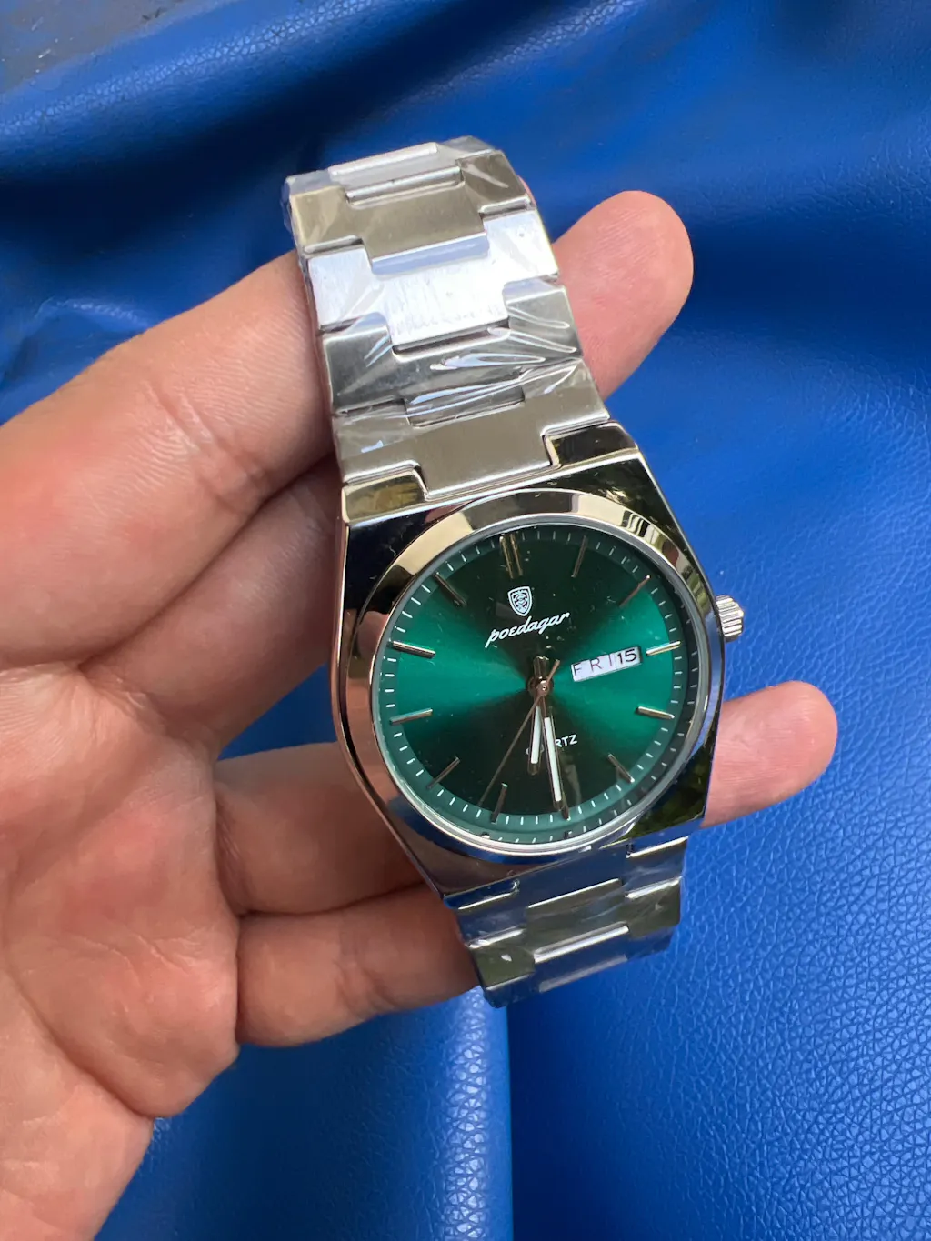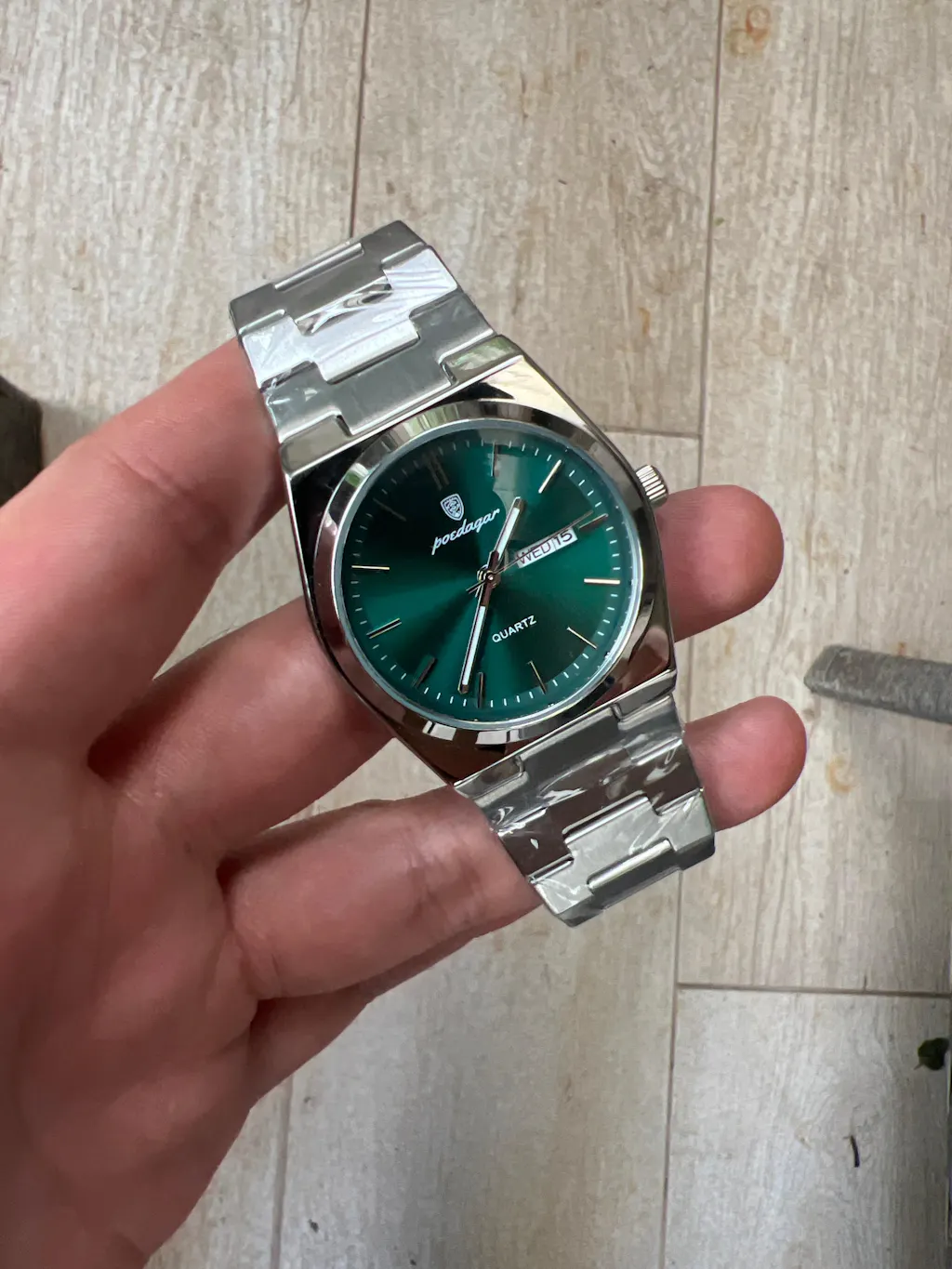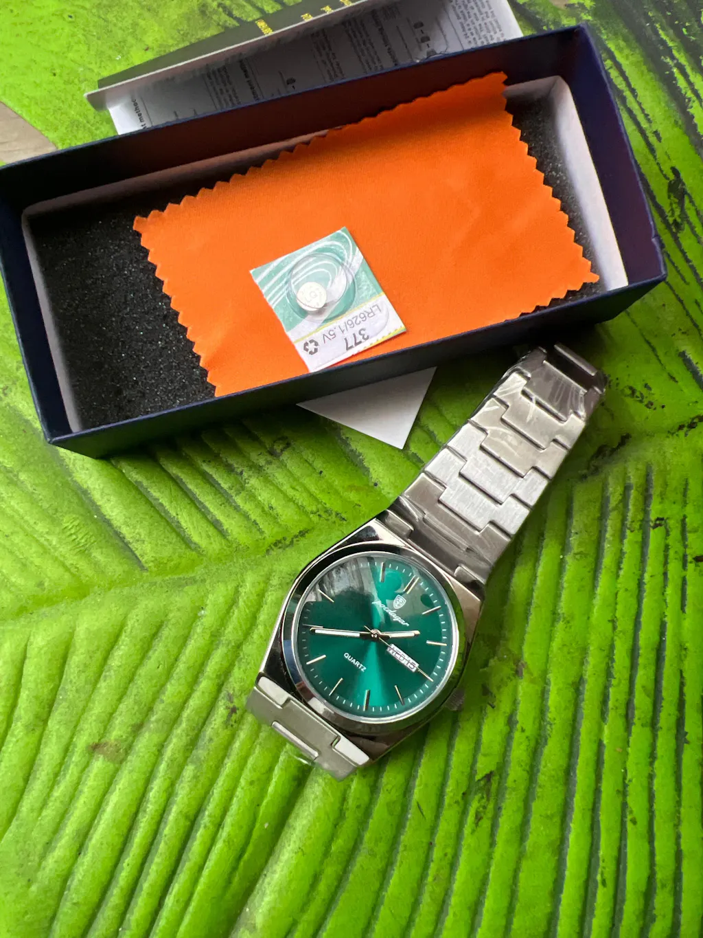 El Reloj Esmeralda tiene una carátula verde que lo hace resaltar con elegancia. Su diseño en acero inoxidable le da un toque moderno y resistente, ideal para usar en cualquier momento del día.